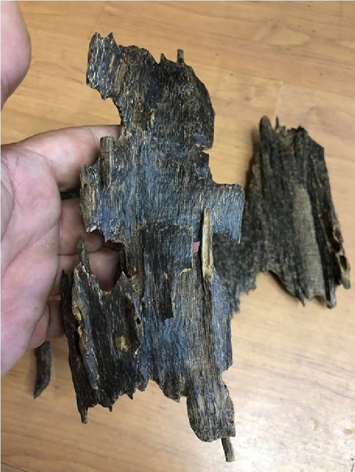 沉香樹受傷而樹脂包覆在蛀洞外,所產生的沉香。